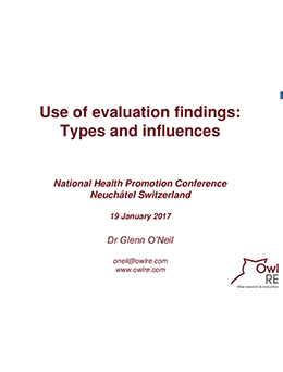 How are evaluation findings actually used? This presentation by Glenn examines what are the different types of evaluation use and what influences use. Originally presented at the Swiss National Health Promotion Conference, 19 January 2017.